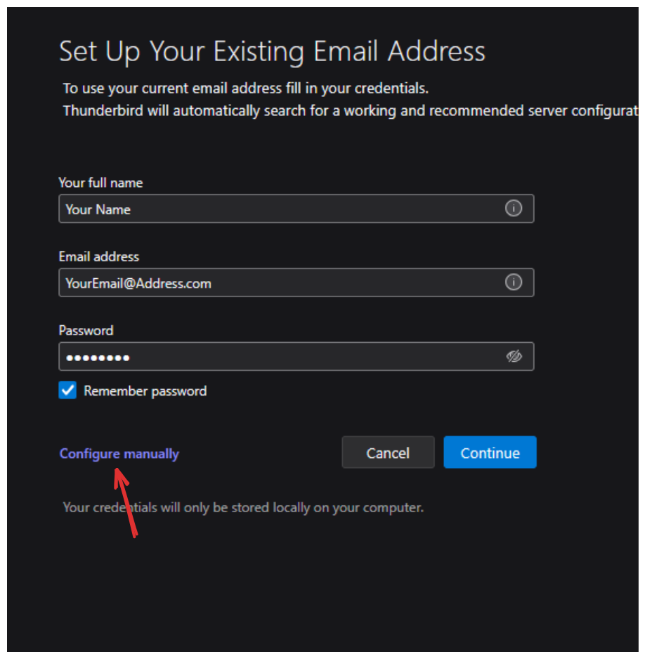 3. Insert the name you would like displayed when sending emails, full email address, and password. Then click on “Configure manually“.