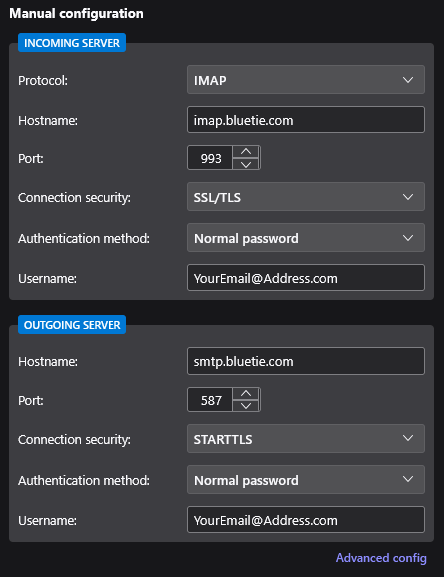 – Hostname: imap.bluetie.com