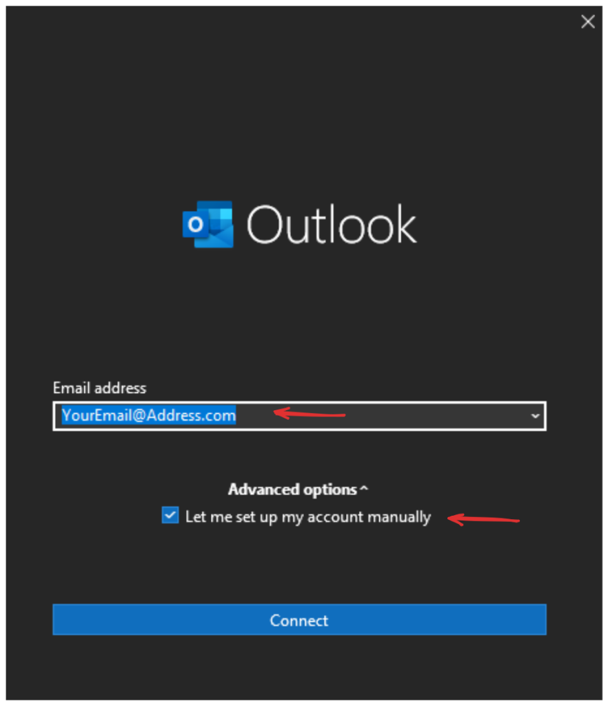 2. Click on ‘Advanced options’ and check the box for ‘Let me set up my account manually’