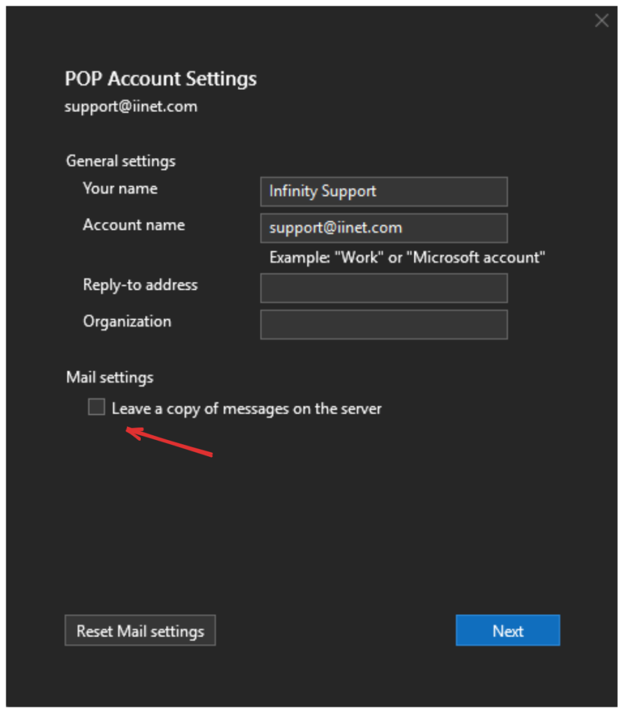 - Select the email account that was just added and under Mail Settings > Then click “Change”. Another pop up will appear. Make sure the box for ‘Leave a copy of messages on the server’ is checked and ‘Remove from server after x days’ is unchecked.