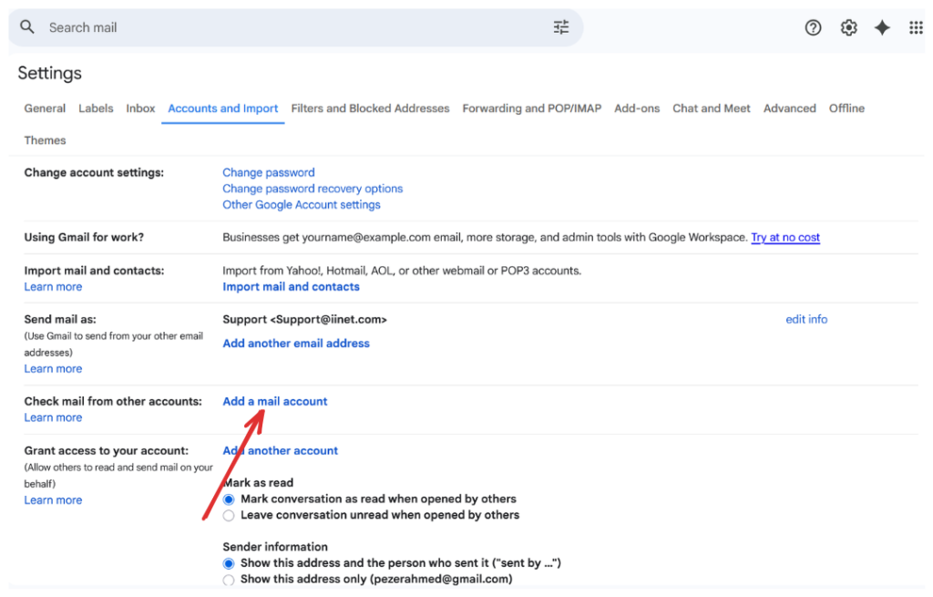 - Click “Add a mail account” in the section labeled “Check mail from other accounts:”
