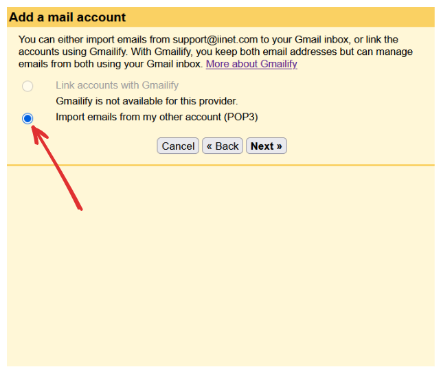 - Select “Import emails from my other account (POP3) and click “Next”