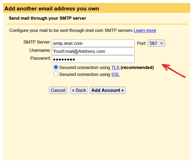 – If you uncheck “Treat as an alias” then the next page will prompt you for outgoing server settings. Input: smtp.iinet.com