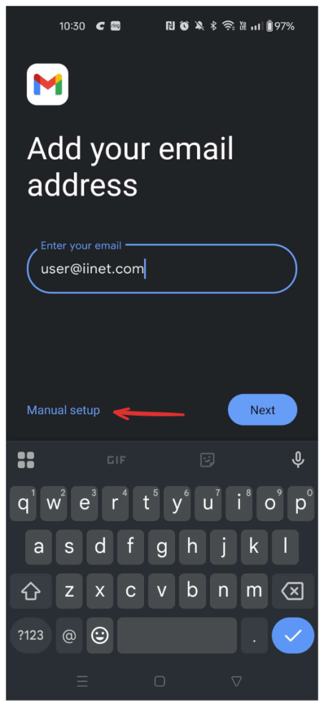 3. Enter your full email address then select the option for “MANUAL SETUP” before hitting the “NEXT” button.